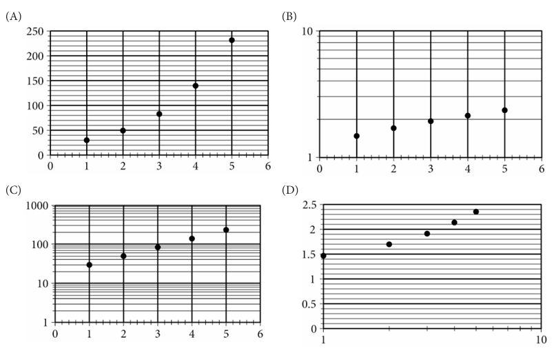 14. The function \(g\) has the property that for each time the input values double, the output values increase by 1. Which of the following could be the graph of \(y=g(x)\) in the \(xy\)-plane?