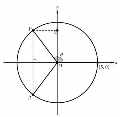 16. The figure shows a circle centered at the origin with an angle of measure \(\theta\) radians in standard position. The terminal ray of the angle intersects the circle at point \(P\), and point \(R\) also lies on the circle. The coordinates of \(P\) are \((x,y)\), and the coordinates of \(R\) are \((x,-y)\). Which of the following is true about the sine of \(\theta\)?