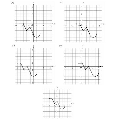 9. The graph of \(y=f(x)\), consisting of four line segments and a semicircle, is shown for \(-3 \le x \le 3\). Which of the following is the transformed graph for \(y=f(x+1)-2\)?