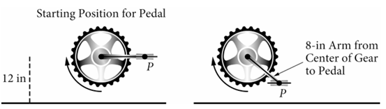 27. A physical therapy center has a bicycle that patients use for exercise. The height, in inches (in.), of the bicycle pedal above level ground periodically increases and decreases when used. The figure gives the position of the pedal \(P\) at a height of \(12\) inches above the ground at time \(t=0\) seconds. The pedal’s \(8\)-inch arm defines the circular motion of the pedal. If a patient pedals \(1\) revolution per second, which of the following could be an expression for \(h(t)\), the height, in inches, of the bicycle pedal above level ground at time \(t\) seconds?