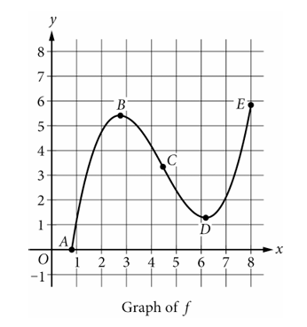 3. The figure shows the graph of a function \(f\). The zero and extrema for \(f\) are labeled, and the point of inflection of the graph of \(f\) is labeled. Let \(A, B, C, D,\) and \(E\) represent the \(x\)-coordinates at those points. Of the following, on which interval is \(f\) increasing and the graph of \(f\) concave down?